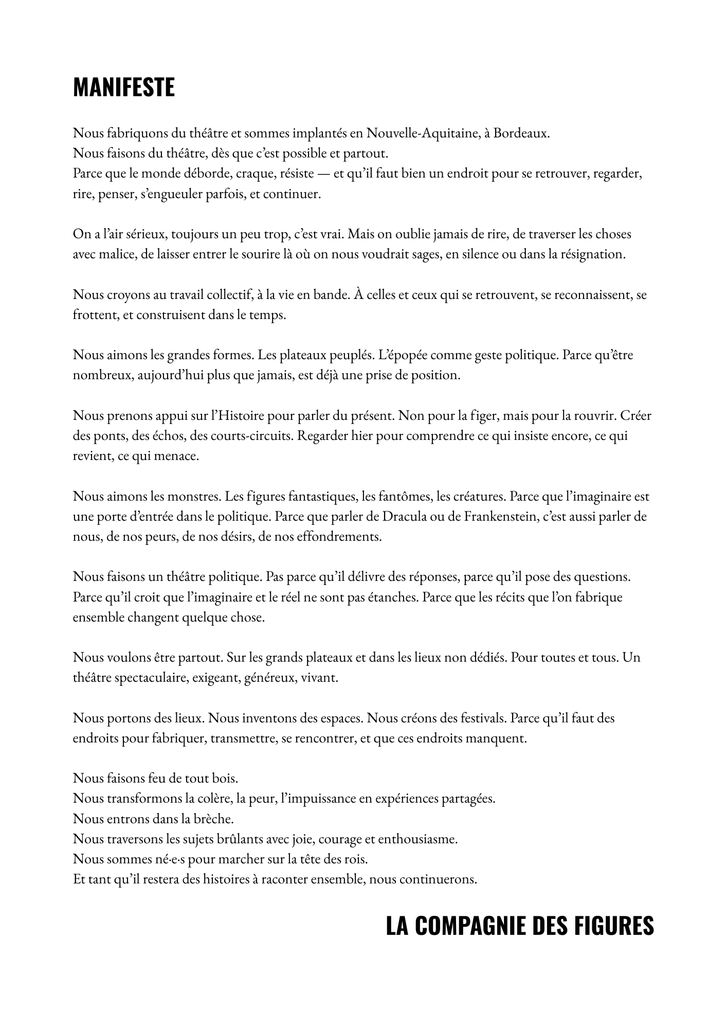 Nous faisons un théâtre politique. Pas parce qu’il délivre des réponses, parce qu’il pose des questions. Parce qu’il croit que l’imaginaire et le réel ne sont pas étanches. Parce que les récits que l’on fabrique ensemble changent quelque chose.